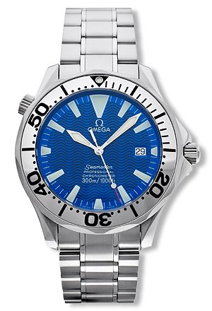 Set sail with confidence and style to points unknown with this classic Omega Seamaster stainless steel men’s automatic chronometer watch, a highly accurate timepiece that’s as comfortable negotiating deals in the boardroom as it is navigating the breaking seas. It’s also a great diving watch, with water resistance to 300 meters (984 feet), screw-down helium release valve at 10 o’clock, and easy-to grasp rotating bezel—even with wet suit gloves. Definitively masculine in design, it features a large, round silver stainless steel watch case that blends brushed and polished surfaces and measures 44mm (1.73 inches) wide and 11.5mm (0.45 inches) deep. This watch includes an aluminum unidirectional rotating bezel silver with black engraved ten-minute marks (in large Arabic numerals).